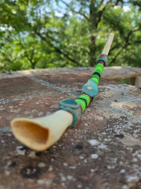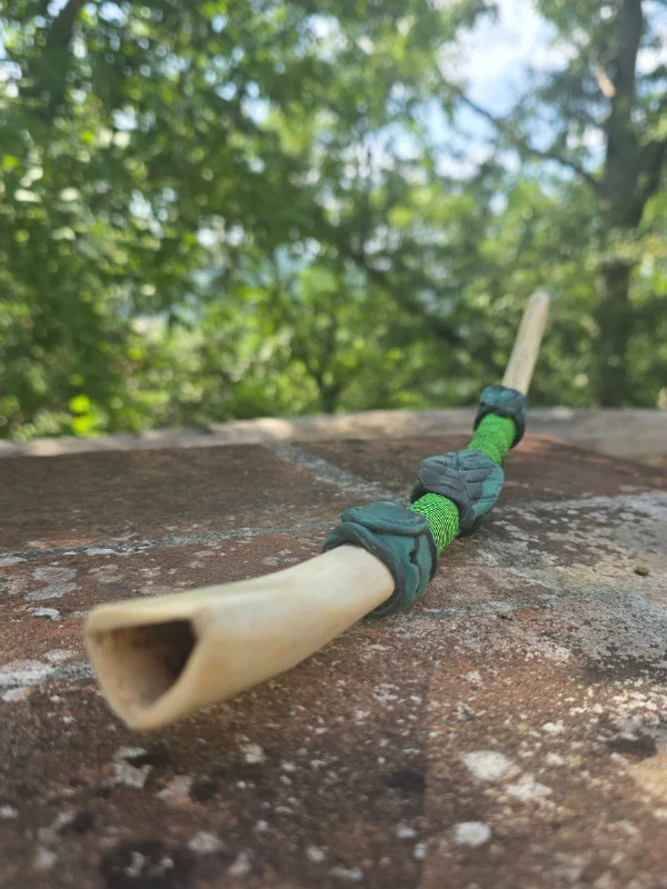 Le ossa di cervo e di scimmia utilizzate nella realizzazione del Tepi hanno un forte valore simbolico nella cosmologia amazzonica. Le decorazioni esterne riflettono la visione spirituale Yawanawa, rendendo ogni strumento unico nella forma e nel significato.
